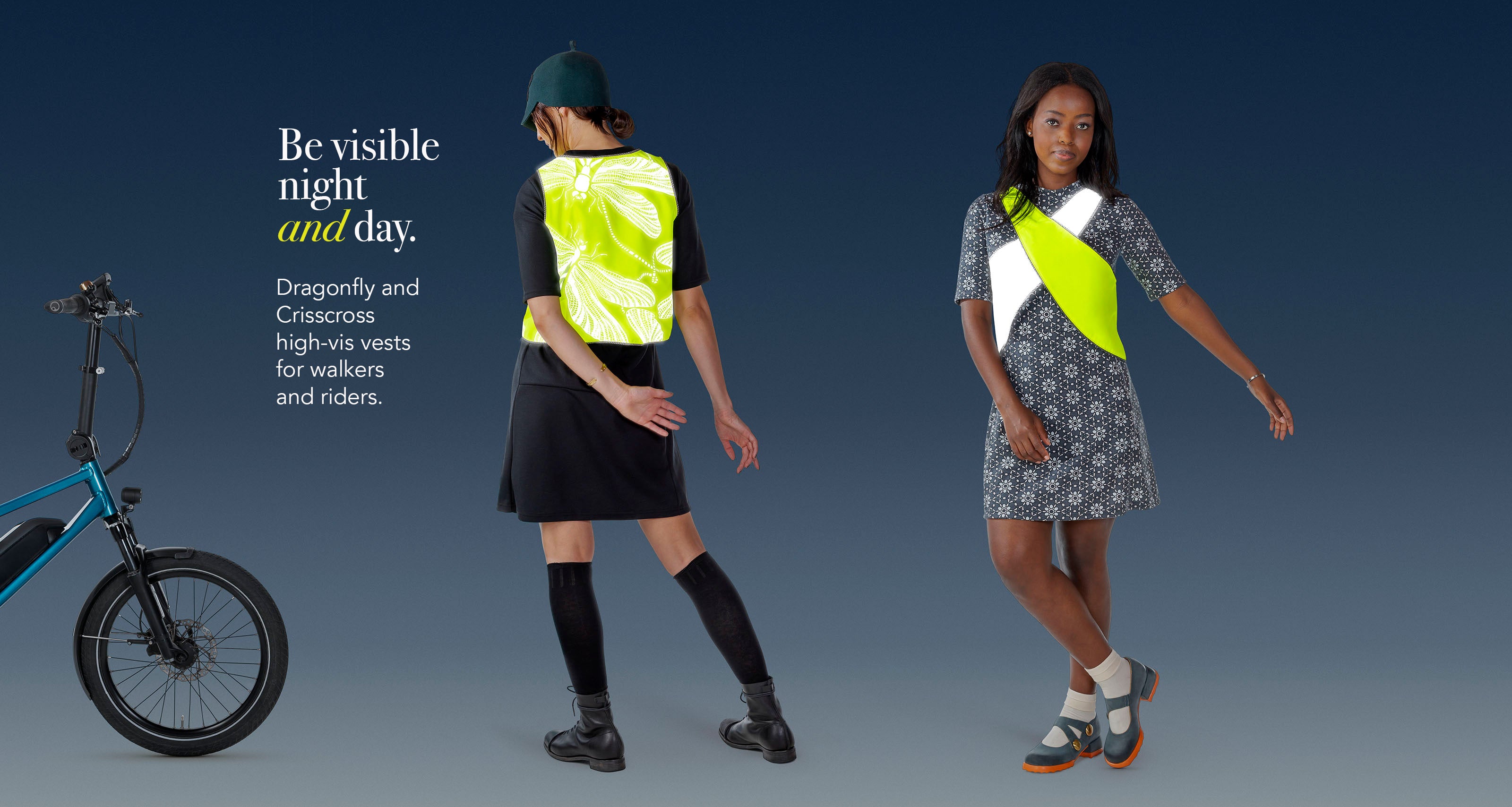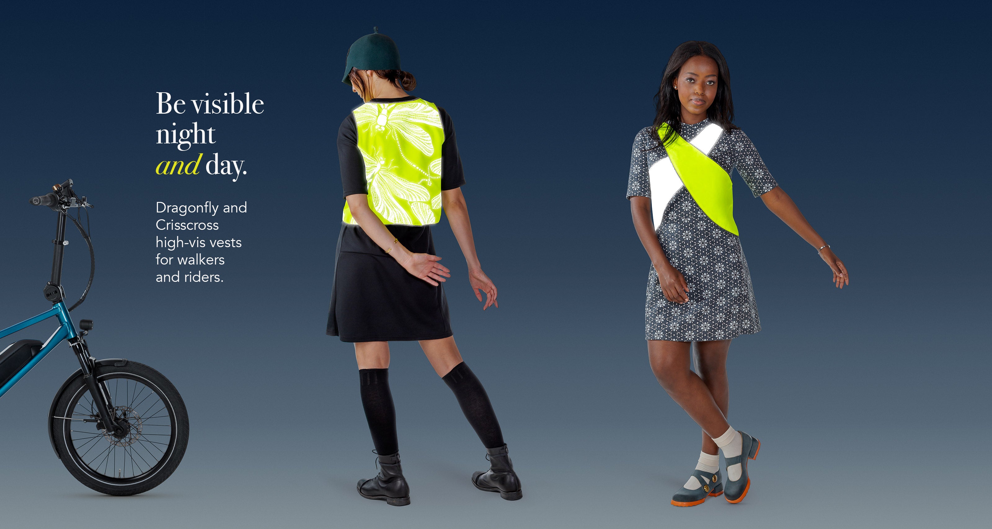 Our modern high-vis reversible vests are made in Vancouver. Choose crisscross or our zippered, snap-up-against-the-chill vest with reflective dragonfly on the back.