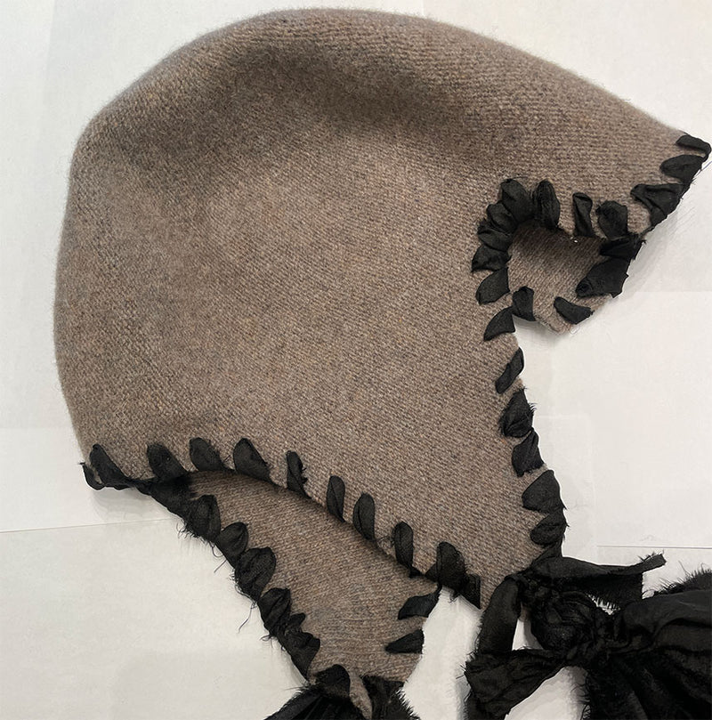 Merino wool caps with silk ribbons or tassels. Worn under helmets. Made in Canada.